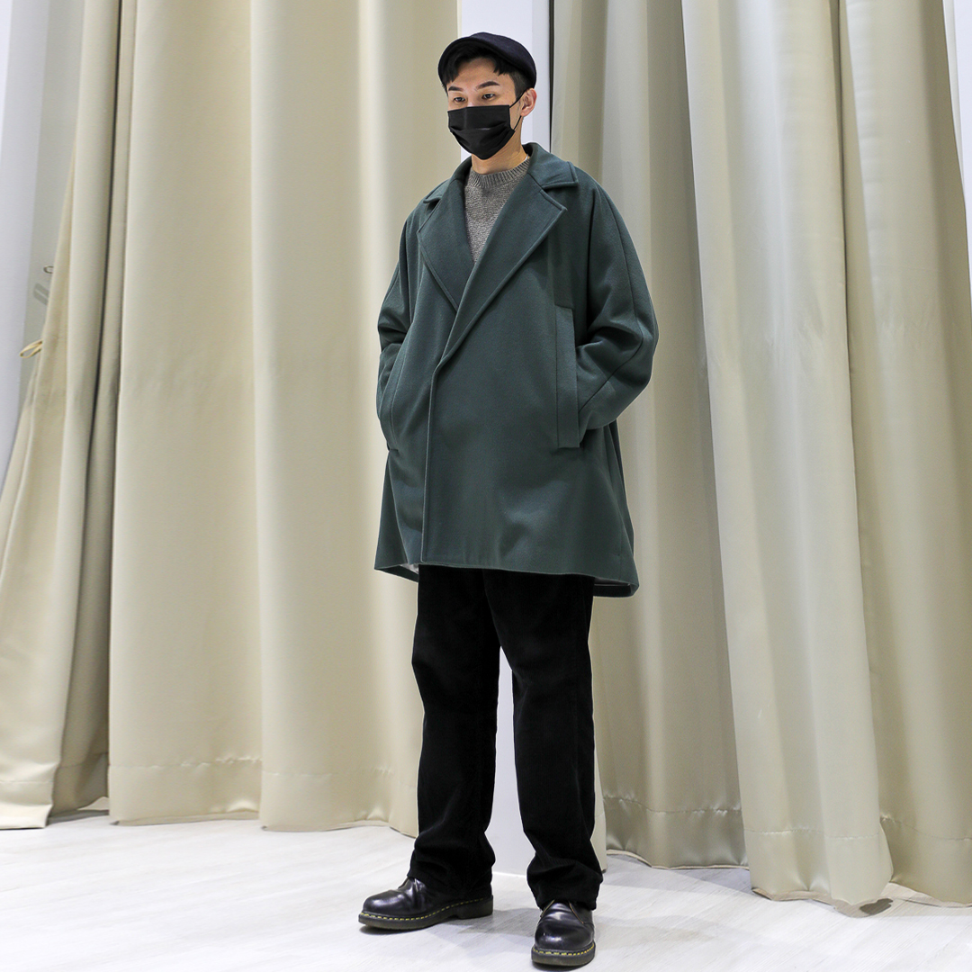 HsinNan著用的短大衣長度恰到好處,適合各種搭配。內搭的羊毛針織衫也完美發揮保暖效果。