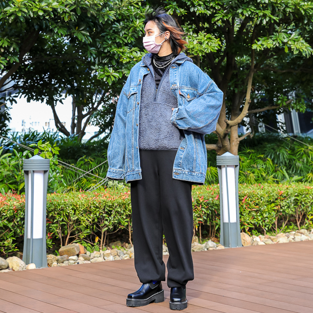 灰藍色的絨毛連帽上衣與牛仔外套,兼具配色與保暖度!除此之外內搭的黑色高領也增加整體層次感。