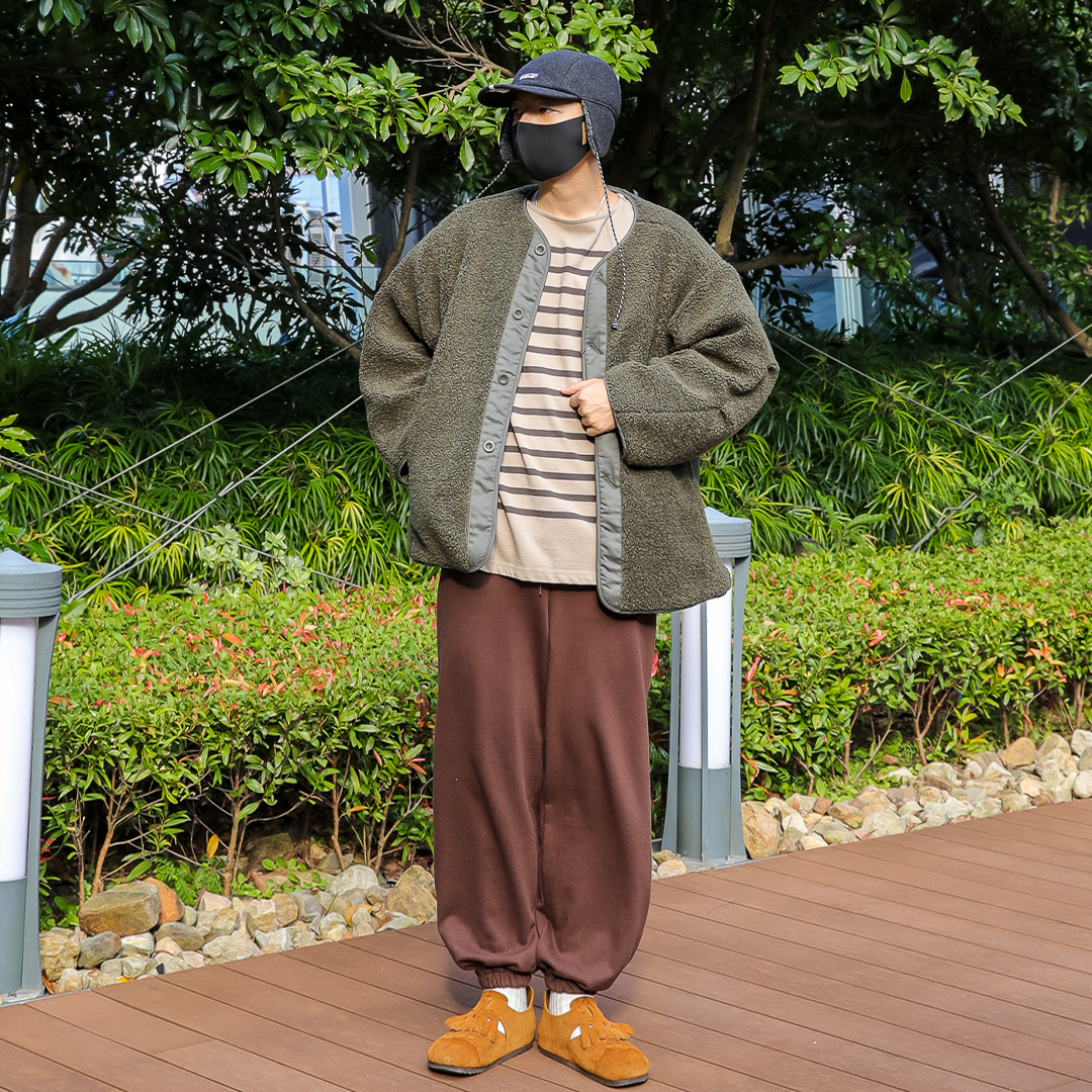 整體以大地色系呈現,用色豐富不單調。內搭的橫條紋上衣適當點綴其他素色單品;帽子與外套皆有使用絨毛材質,保暖滿分!