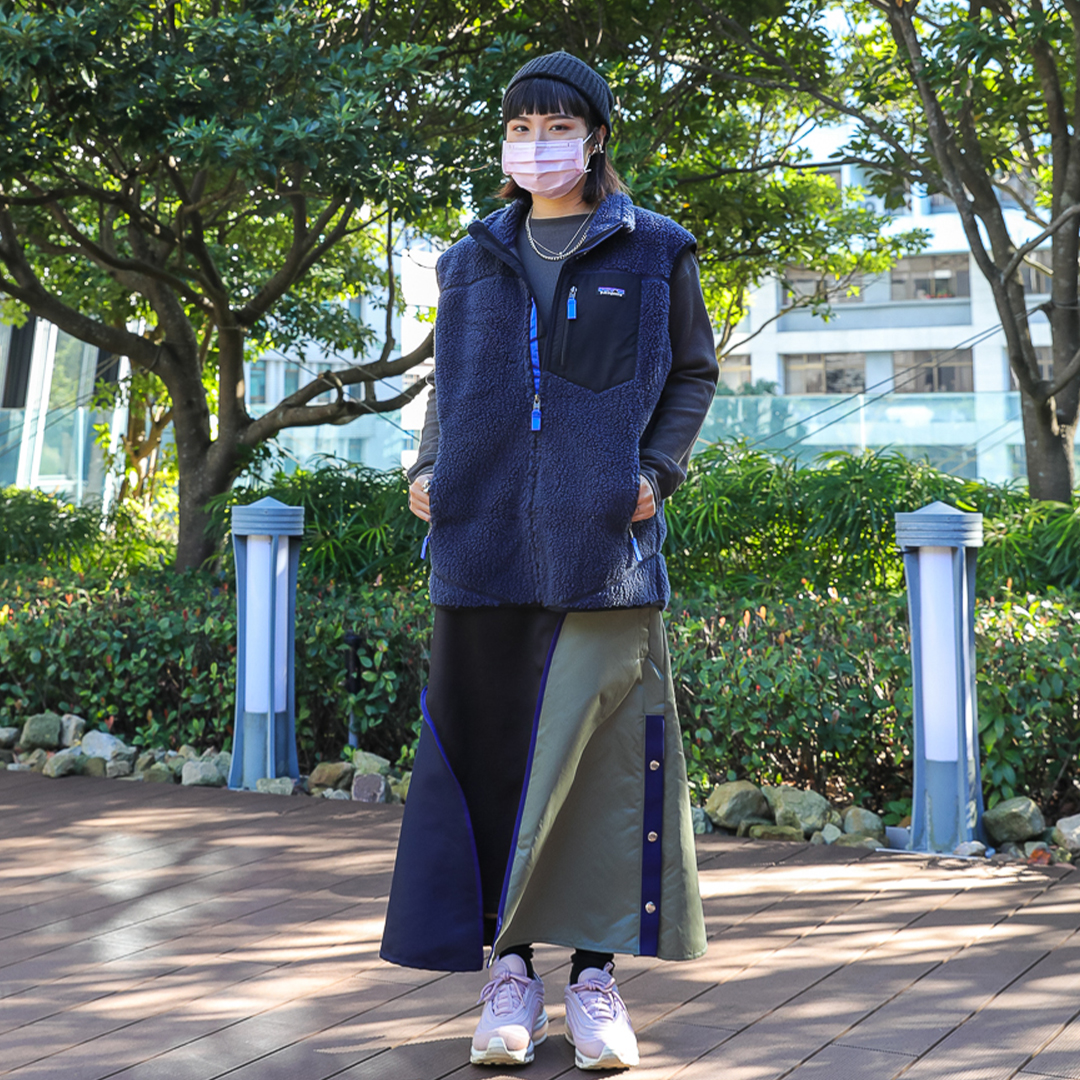 全身以深藍色單品互相搭配,背心的絨毛材質與下身的異元素組合,細節設計都為整體穿搭增加可看性。