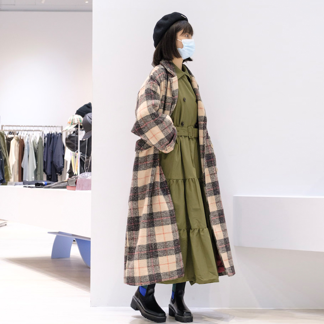 內搭的風衣外套除了外罩衫使用,扣起來也能是件可愛有型的洋裝!而軍綠搭配卡其/紅色格紋的跳色感也十分協調舒服。