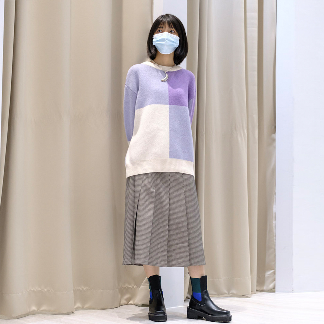 以紫色方格針織衫為搭配亮點,並使用份量感較足的銀飾項鍊來點綴造型,以及千鳥格長裙來為整體穿搭增添細節感!
