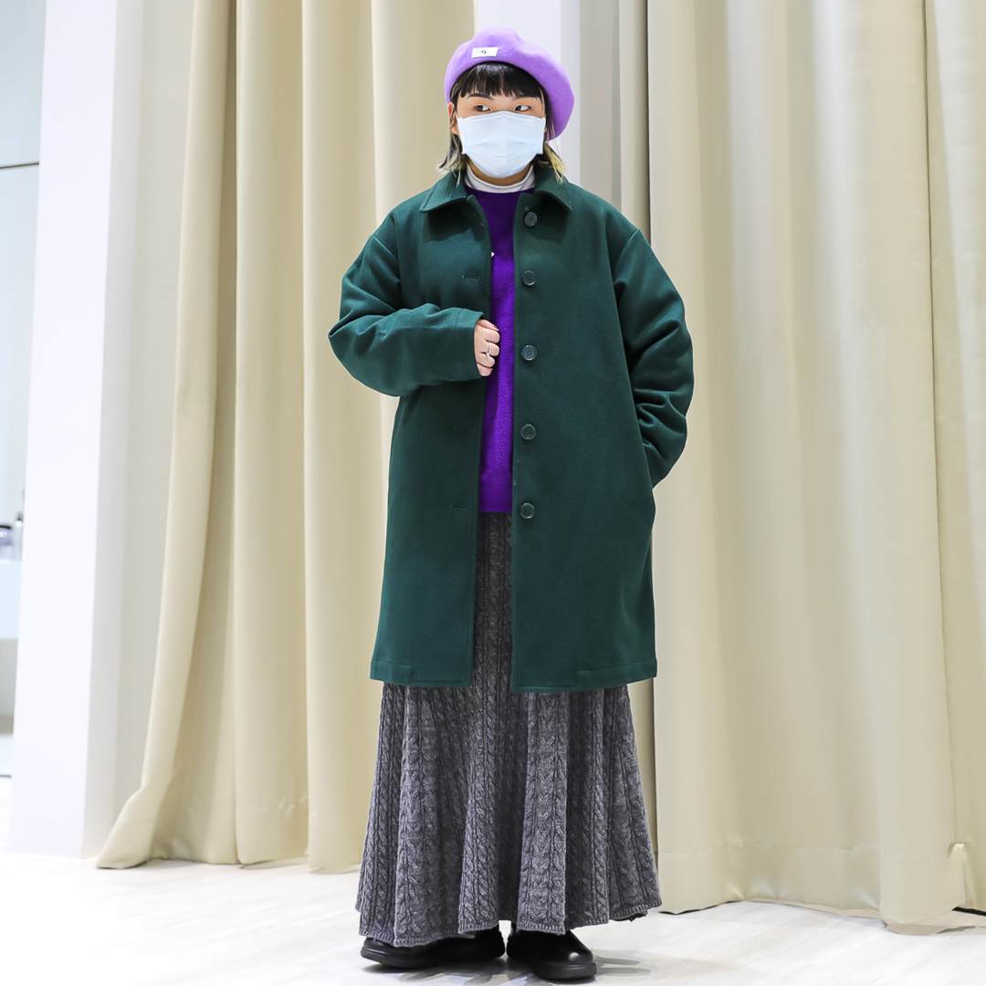 第一套Amber選擇了十分有氣質的高飽和綠色大衣,並在內搭與帽子使用與綠色相襯的紫色單品混搭,使整身調性一致不突兀。