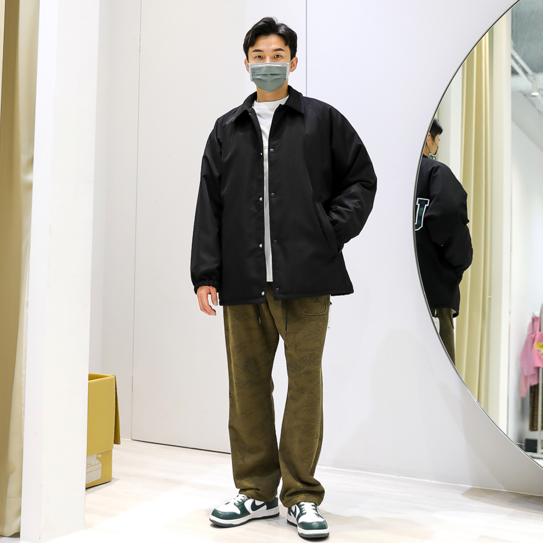 迷彩棉褲因為本身就十分有個性,上半身就以黑白單品簡單搭配,但不只這樣,在外套背面及上衣口袋的細節都讓整身穿搭更有可看性。