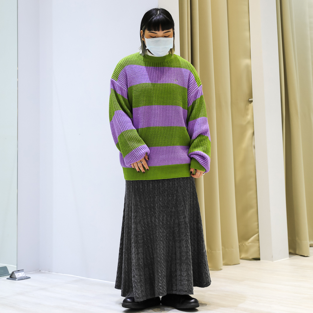 以綠、紫橫條紋針織衫為搭配亮點,下身選用深色的裙子平衡視覺讓整體更協調!