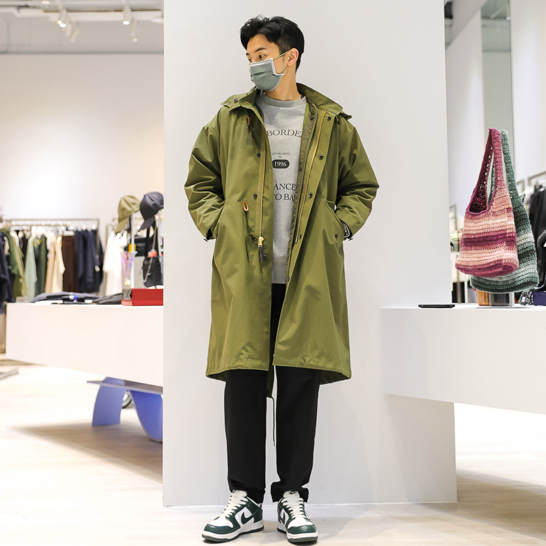 軍綠可說是綠色單品中最好掌控的,內搭經典灰色大學T與黑色長褲,是每天都可使用的穿搭提案!