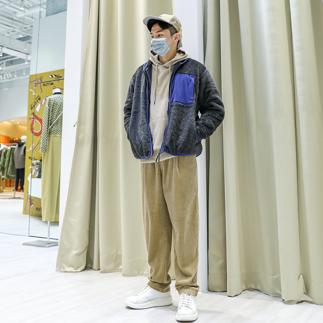 經典的綠色軍裝外套搭配咖啡色燈芯絨長褲,整體大地色系的視覺感相當到位。