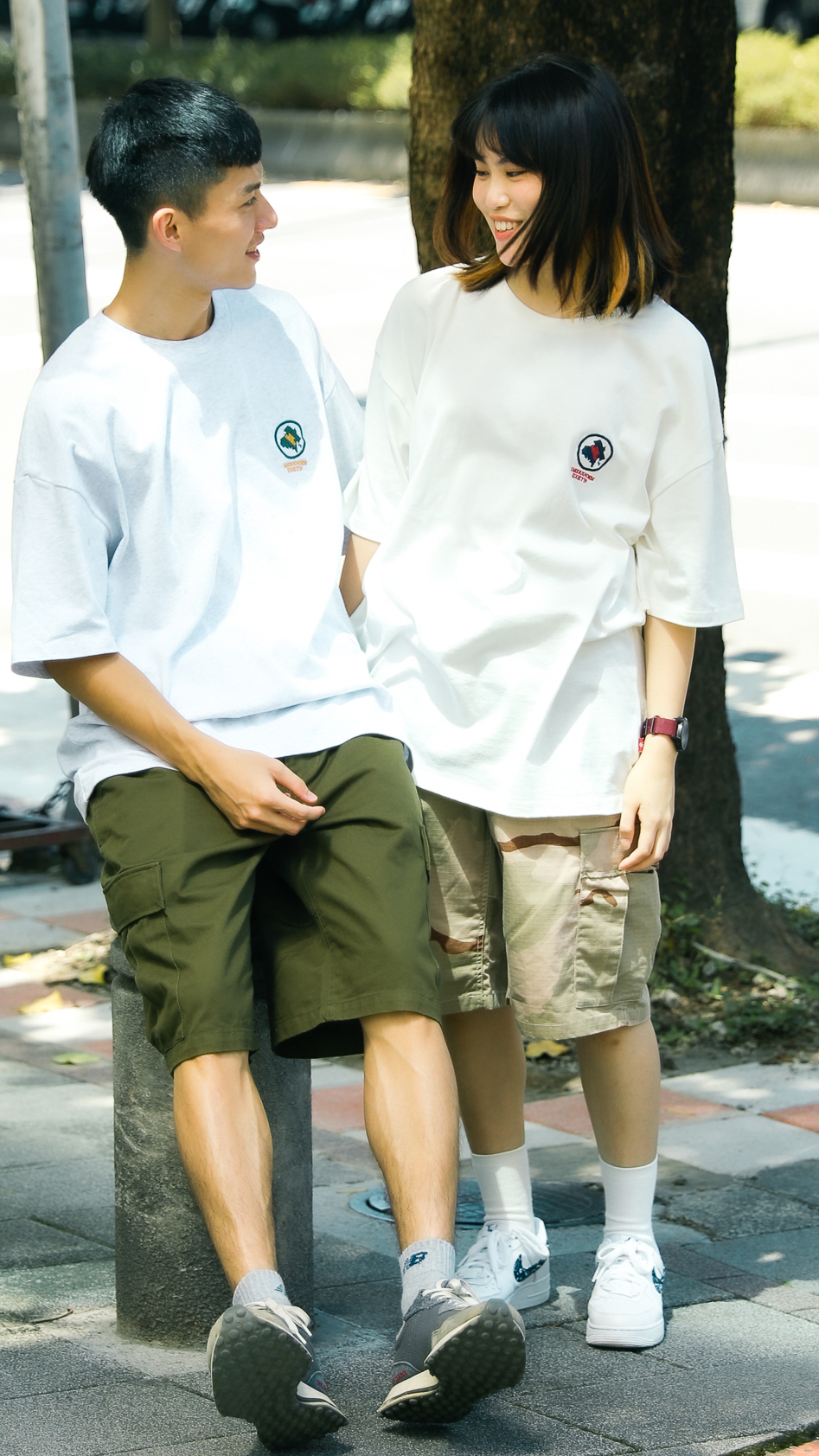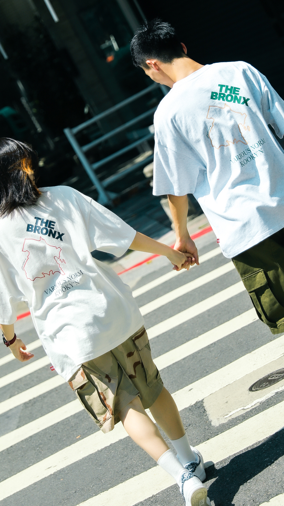 最不易出錯的情侶穿搭無非就是同色系搭配!而同色系又不想看起來太過呆版,就從細節與配色的著墨下手,上身選擇麻灰和白色款式,雖看似皆為相似色調,但透過BRONX刺繡logoT恤背後的撞色搭配,讓整體更加突出!而下身以軍綠搭配迷彩,在協調的搭配中也展現更多變化性。